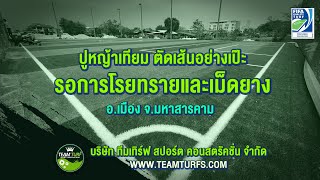 ปูหญ้าเทียม ตัดเส้นอย่างเป๊ะ รอการโรยทรายและเม็ดยาง